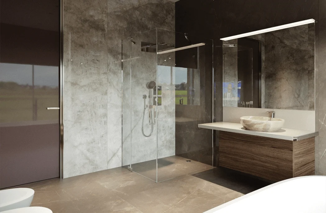 RaceDeck covering, entrance ramp trimmed with natural travertine